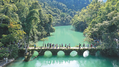 贵州省荔波县小七孔景区里,游客畅游青山绿水,乐享夏日时光。肖伟摄(人民图片)