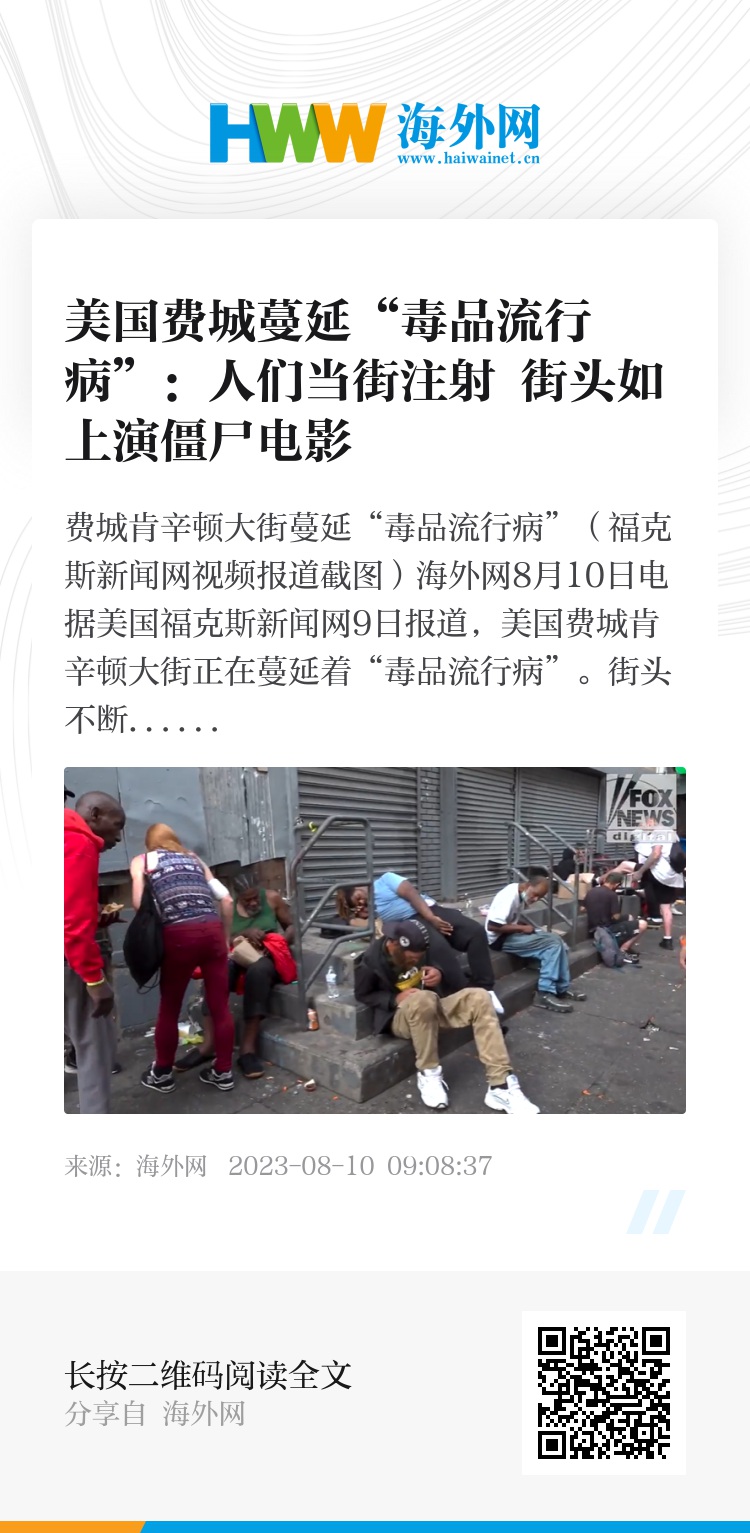海外网8月10日电 据美国福克斯新闻网9日报道,美国费城肯辛顿大街正在蔓延着“毒品流行病”。街头不断有人当街注射毒品,吸毒者身上布满血肉绽开的伤口,还有遗体横卧街头。一名在当地的戒毒者称,“这里如同在上演僵尸电影。”
