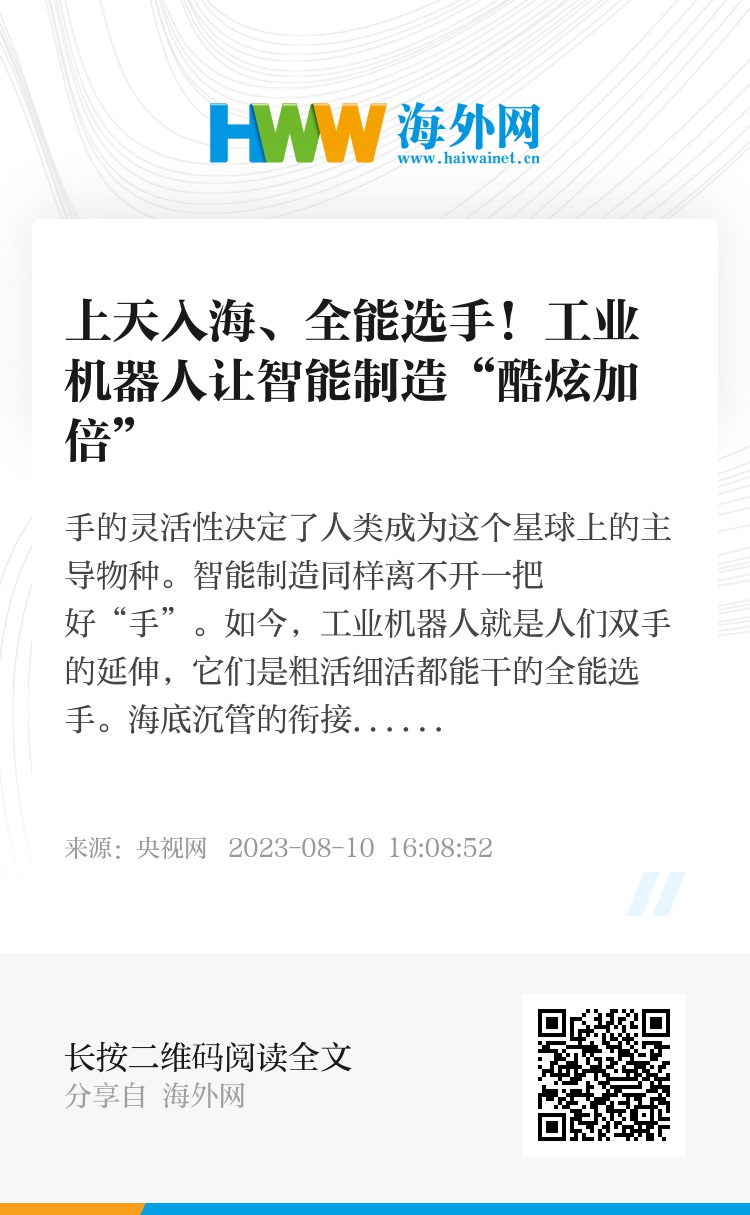 手的灵活性决定了人类成为这个星球上的主导物种。智能制造同样离不开一把好“手”。如今,工业机器人就是人们双手的延伸,它们是粗活细活都能干的全能选手。海底沉管的衔接,“超级焊匠”一出手就能搞定;加工光学模具的工业母机可以做到“天衣无缝”;扛大梁的机器人手臂上,真的有一个“太阳系”吗?给超级水利工程做全息体检和局部手术的究竟又是何方“圣手”?