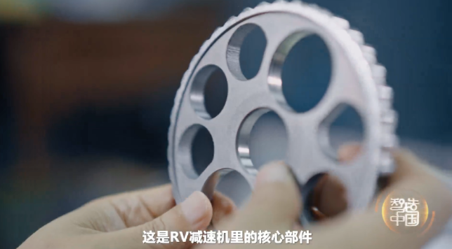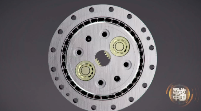 打开RV减速机,里面就像一个太阳系,既有太阳轮,也有行星轮。这就是RV减速机的摆线行星轮,它们就像围绕太阳的行星,既有自转也有公转,自转一圈的同时公转40圈,通过多组行星运动实现精密传动,把电机的高速转动降下来,同时增大转矩,驱动机器人手臂旋转。