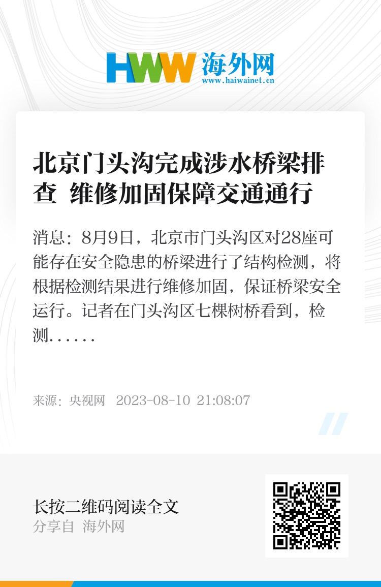 截至目前,28座损坏桥梁已全部完成结构检测,其中,5座桥梁情况较为严重,结构存在安全隐患。接下来,门头沟区将把这5座桥梁列入灾后重建计划,实行一桥一方案。对其余23座桥梁护栏缺损、桥面损坏等问题及时组织修复,保障交通通行。