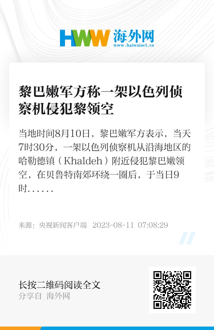 当地时间8月10日,黎巴嫩军方表示,当天7时30分,一架以色列侦察机从沿海地区的哈勒德镇(Khaldeh)附近侵犯黎巴嫩领空,在贝鲁特南郊环绕一圈后,于当日9时15分离开黎领空。