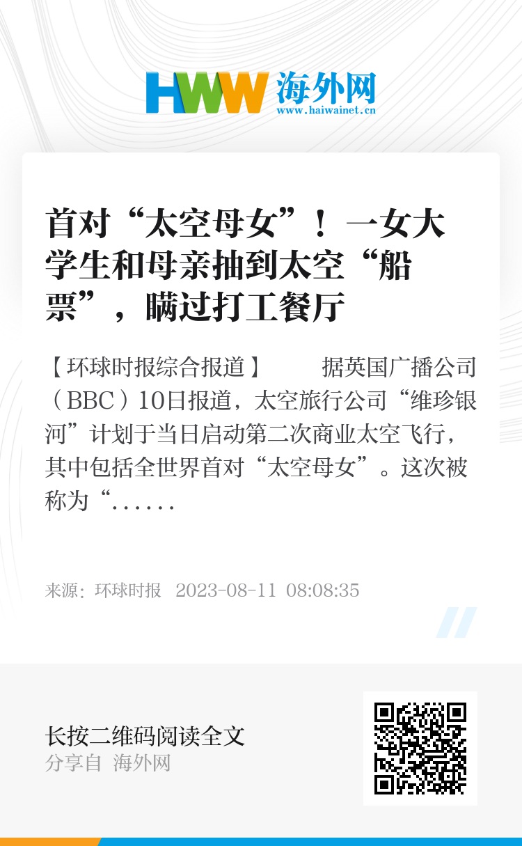 【环球时报综合报道】 据英国广播公司(BBC)10日报道,太空旅行公司“维珍银河”计划于当日启动第二次商业太空飞行,其中包括全世界首对“太空母女”。