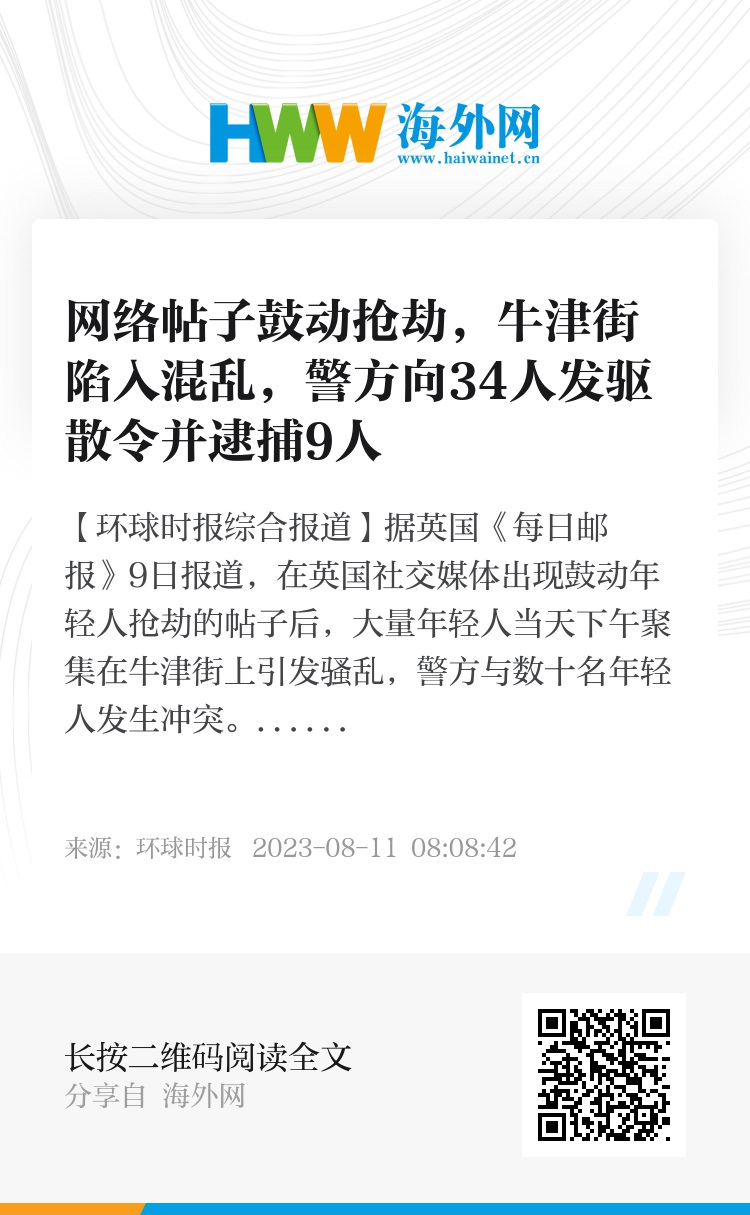 【环球时报综合报道】据英国《每日邮报》9日报道,在英国社交媒体出现鼓动年轻人抢劫的帖子后,大量年轻人当天下午聚集在牛津街上引发骚乱,警方与数十名年轻人发生冲突。报道称,警方已向34人发出驱散令,并逮捕了9人,这些人涉嫌违反驱散令、盗窃、袭击警察、扰乱公共秩序等。英国伦敦警察厅称,有2人因在社交媒体上发帖串谋抢劫而在埃塞克斯被捕。