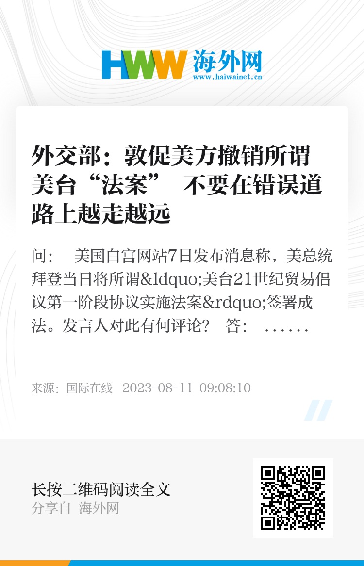 问:美国白宫网站7日发布消息称,美总统拜登当日将所谓“美台21世纪贸易倡议第一阶段协议实施法案”签署成法。发言人对此有何评论?