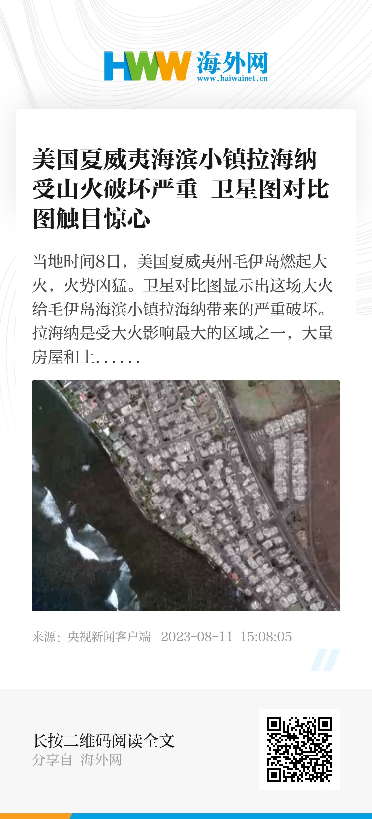 在这组卫星图中,左边为拉海纳今年6月23日的卫星图,右边为8月9日的卫星图,对比图显示,该镇几乎所有房屋都变为废墟,城镇中的树木、绿植被大片烧毁,呈焦黑色。