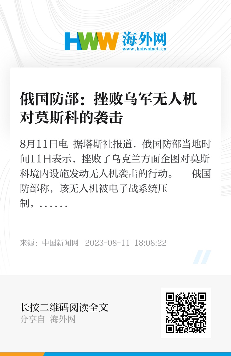俄国防部称,该无人机被电子战系统压制,在莫斯科市西部的森林中坠毁。此次袭击未造成人员伤亡和财产损失。