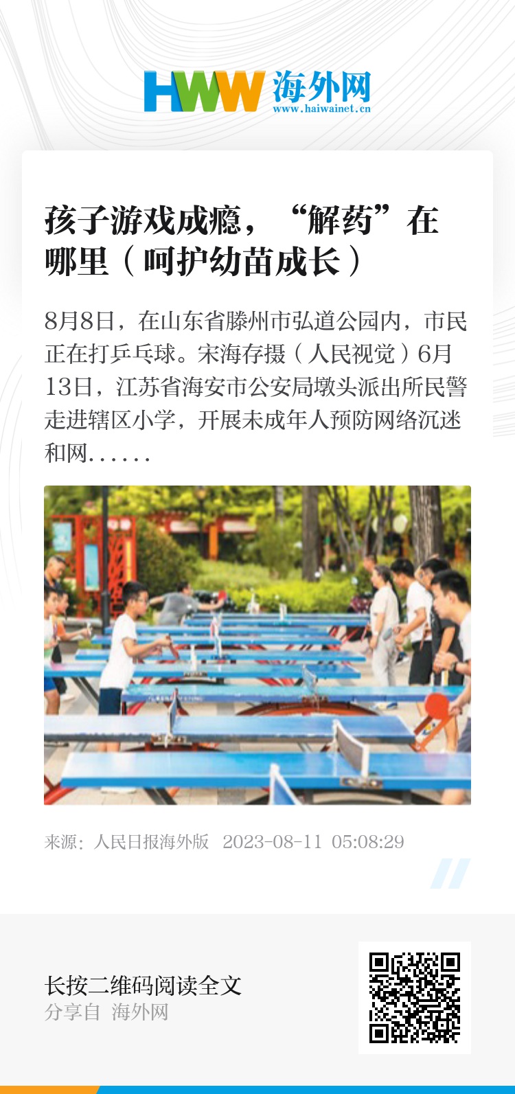 “游戏成瘾受孩子的成长经历和环境影响极大,良好亲子关系是游戏成瘾的最佳‘解药’。”杨可冰呼吁,暑期家长应尽量抽出时间,在现实世界里多陪伴孩子,才能从根本上预防游戏成瘾。(记者 王美华)