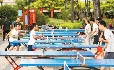 8月8日,在山东省滕州市弘道公园内,市民正在打乒乓球。宋海存摄(人民视觉)