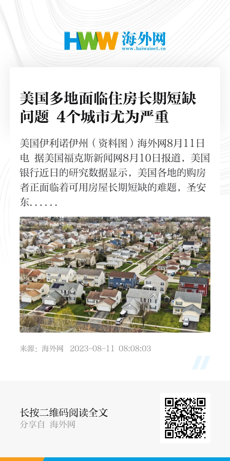 海外网8月11日电 据美国福克斯新闻网8月10日报道,美国银行近日的研究数据显示,美国各地的购房者正面临着可用房屋长期短缺的难题,圣安东尼奥、达拉斯、休斯顿、奥兰多这4个城市的短缺情况尤为明显。