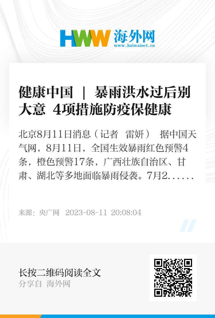 灾害过后,多地灾后重建工作也在有序进行,人们终要重回家园。国家卫健委提示,洪涝灾害发生后,饮食、饮水、消毒等方面切莫大意,在清理、重建过程中,做好自我保护,科学卫生防疫,对防止“大灾后大疫”非常重要。国家疾控局、首都医科大学附属北京世纪坛医院等官方账号均发文给出指导。