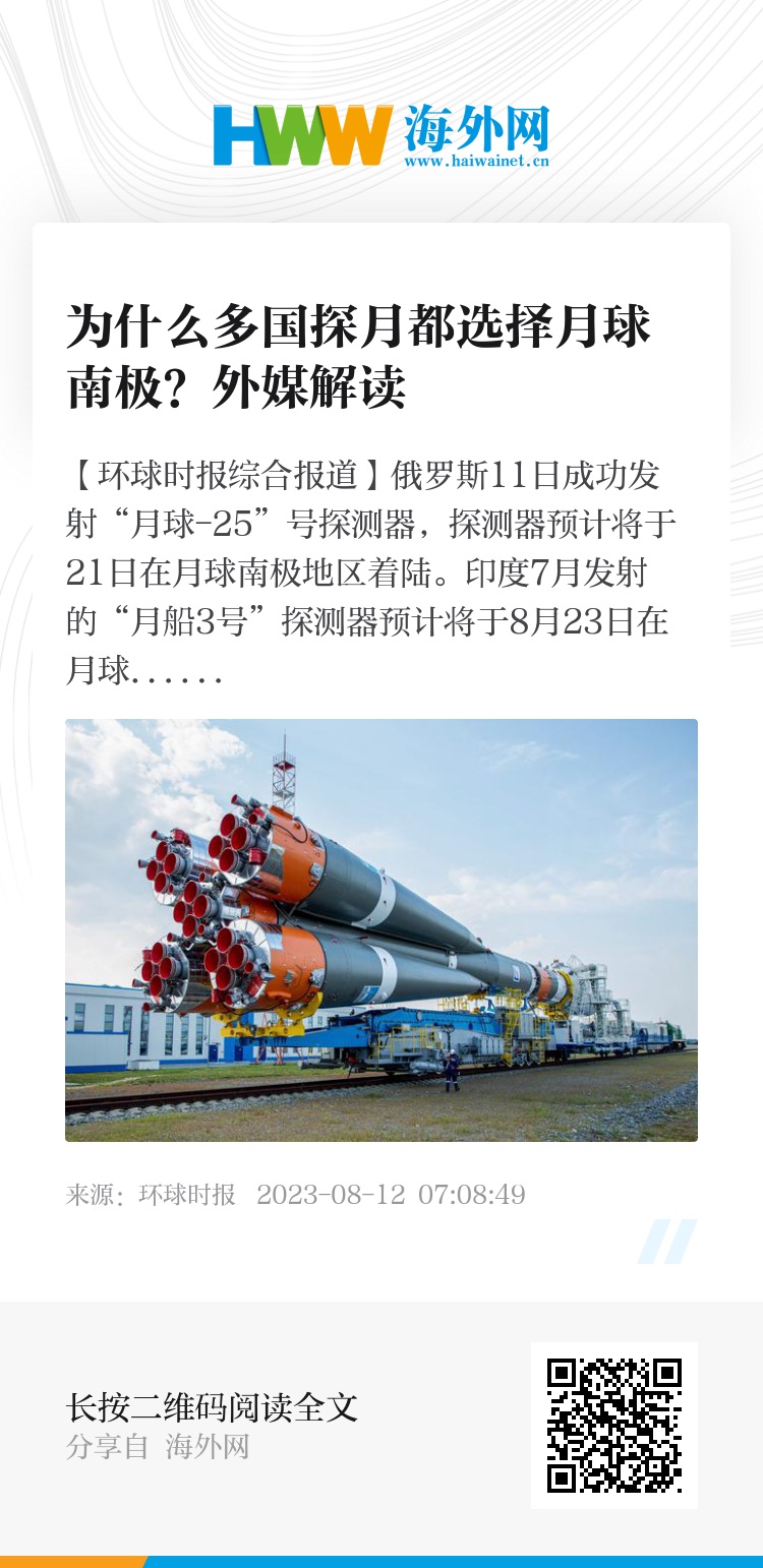 【环球时报综合报道】俄罗斯11日成功发射“月球-25”号探测器,探测器预计将于21日在月球南极地区着陆。印度7月发射的“月船3号”探测器预计将于8月23日在月球南极着陆。中国和美国的探月计划也都分别瞄准月球南极。为何这些大国探月都盯上月球的这个区域?
