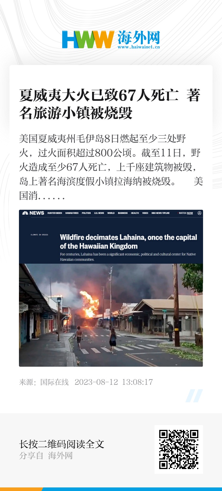 美国夏威夷州毛伊岛8日燃起至少三处野火,过火面积超过800公顷。截至11日,野火造成至少67人死亡,上千座建筑物被毁,岛上著名海滨度假小镇拉海纳被烧毁。