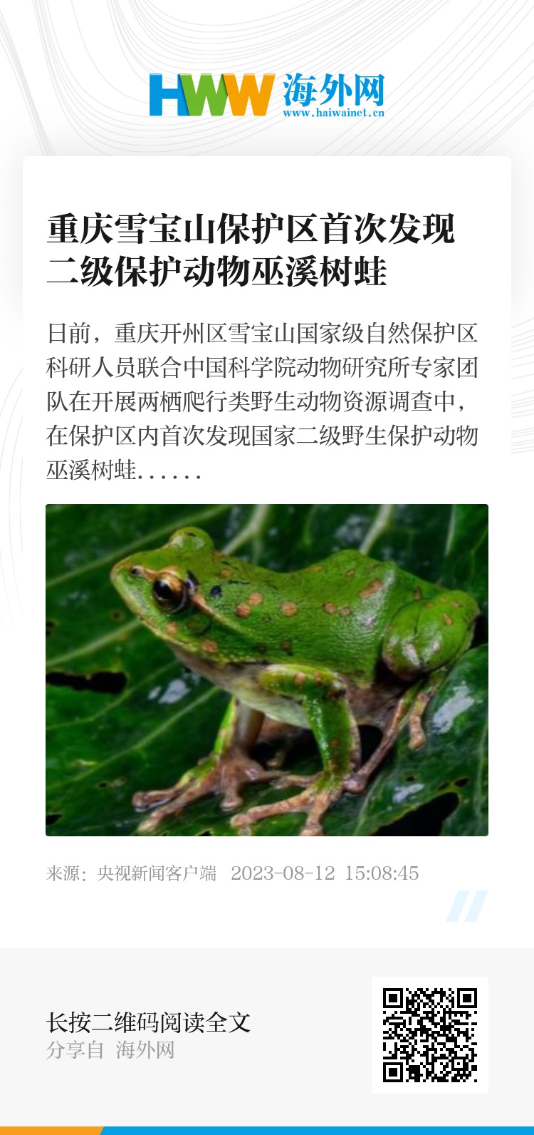 日前,重庆开州区雪宝山国家级自然保护区科研人员联合中国科学院动物研究所专家团队在开展两栖爬行类野生动物资源调查中,在保护区内首次发现国家二级野生保护动物巫溪树蛙。