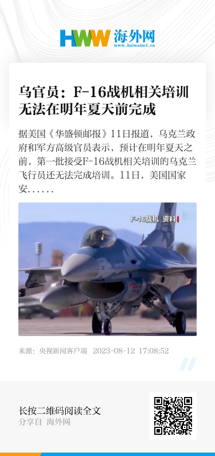 据美国《华盛顿邮报》11日报道,乌克兰政府和军方高级官员表示,预计在明年夏天之前,第一批接受F-16战机相关培训的乌克兰飞行员还无法完成培训。