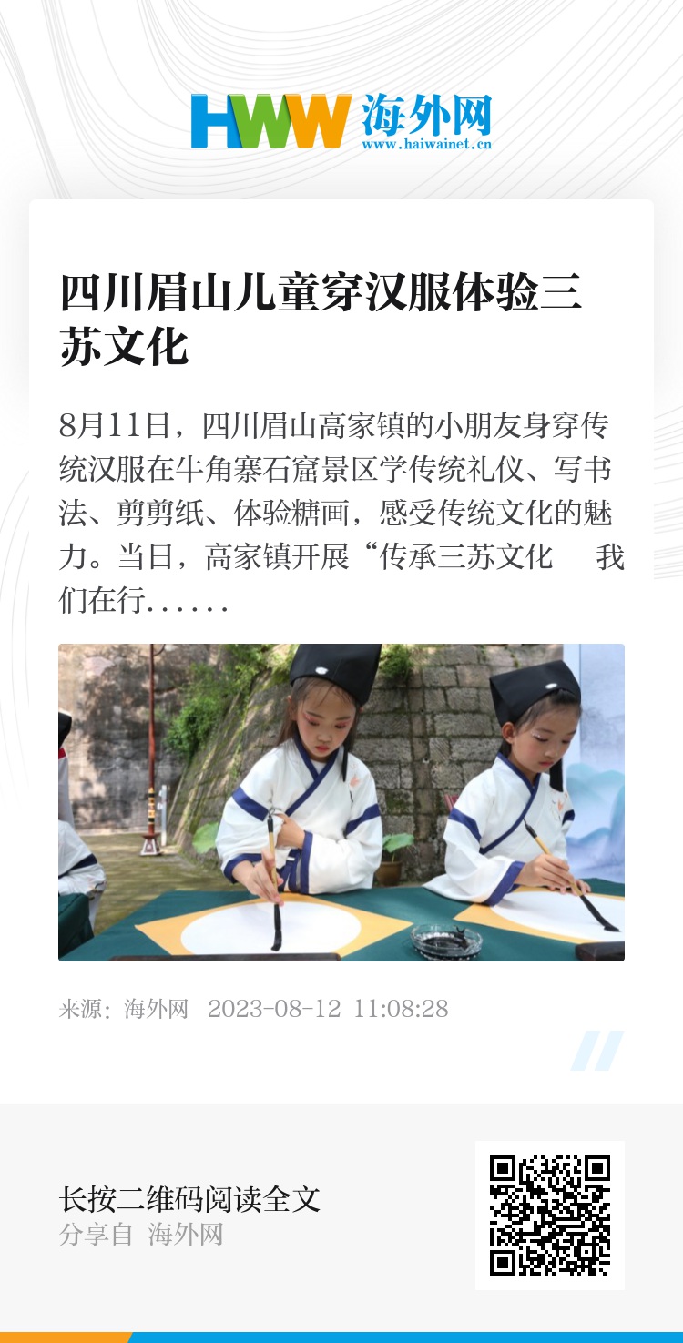 8月11日,四川眉山高家镇的小朋友身穿传统汉服在牛角寨石窟景区学传统礼仪、写书法、剪剪纸、体验糖画,感受传统文化的魅力。当日,高家镇开展“传承三苏文化 我们在行动”活动,20多名小朋友一起穿上汉服,诵读苏东坡经典诗文《水调歌头》,在传承三苏文化中,感受东坡文化魅力,在开心体验中弘扬我国传统文化。图片来源:张忠苹/视觉中国