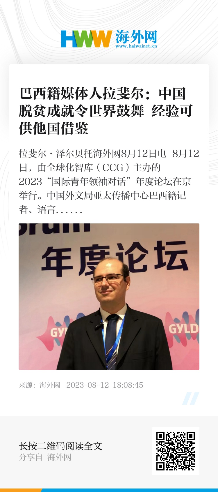 海外网8月12日电 8月12日,由全球化智库(CCG)主办的2023“国际青年领袖对话”年度论坛在京举行。中国外文局亚太传播中心巴西籍记者、语言顾问拉斐尔·泽尔贝托向海外网表示,中国脱贫攻坚工作取得巨大成就,令人鼓舞,可供他国借鉴。