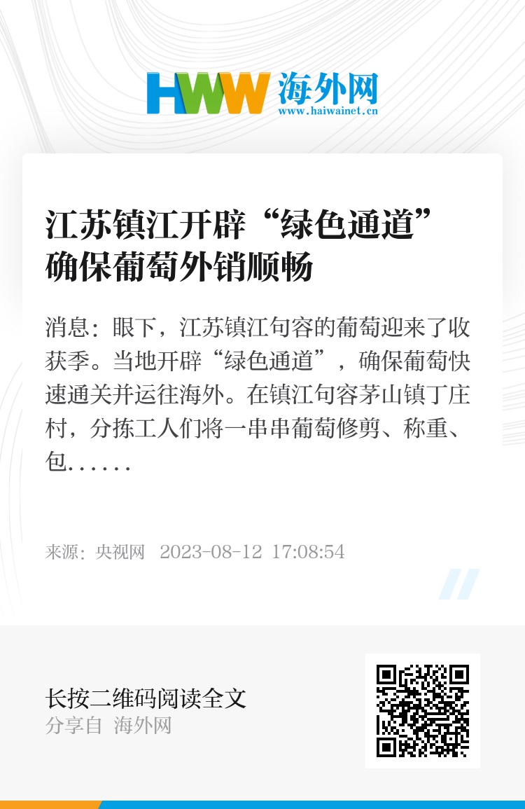 央视网消息:眼下,江苏镇江句容的葡萄迎来了收获季。当地开辟“绿色通道”,确保葡萄快速通关并运往海外。