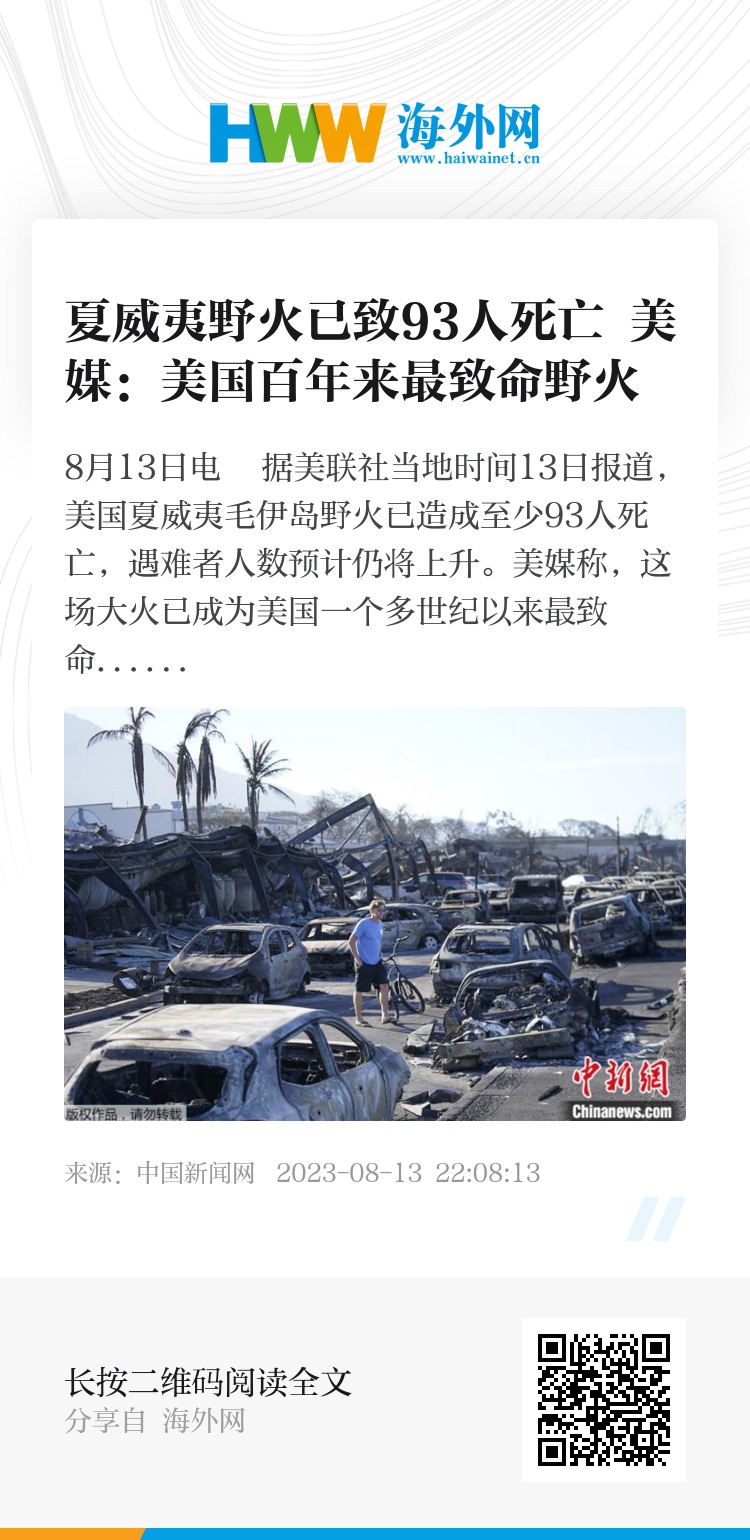 中新网8月13日电 据美联社当地时间13日报道,美国夏威夷毛伊岛野火已造成至少93人死亡,遇难者人数预计仍将上升。美媒称,这场大火已成为美国一个多世纪以来最致命的野火。