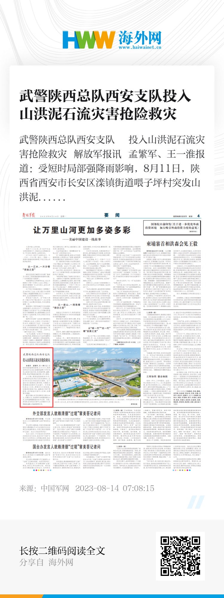 解放军报讯 孟繁军、王一淮报道:受短时局部强降雨影响,8月11日,陕西省西安市长安区滦镇街道喂子坪村突发山洪泥石流灾害,民房被冲毁,道路、桥梁、供电等基础设施受损,多人遇难。