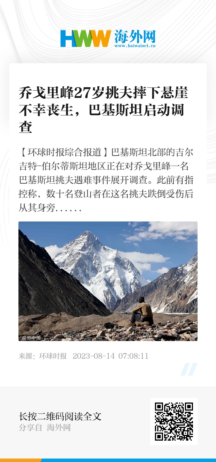 【环球时报综合报道】巴基斯坦北部的吉尔吉特-伯尔蒂斯坦地区正在对乔戈里峰一名巴基斯坦挑夫遇难事件展开调查。此前有指控称,数十名登山者在这名挑夫跌倒受伤后从其身旁经过,却未实施营救。