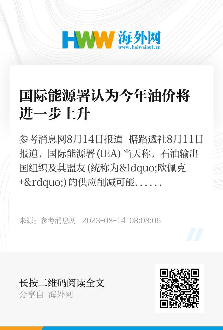 IEA称,预计明年的需求增长将大幅放缓至日均100万桶,原因是宏观经济状况低迷、疫情结束复苏后劲不足以及电动汽车迅速推广使用。