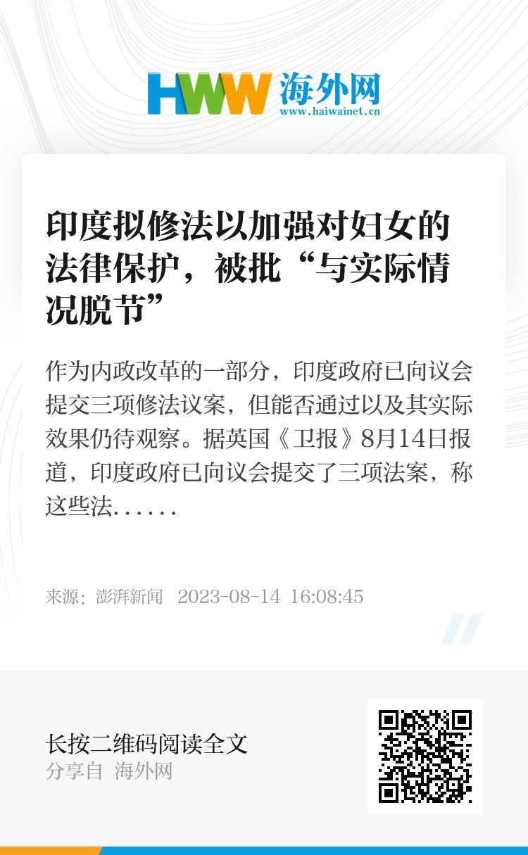 据英国《卫报》8月14日报道,印度政府已向议会提交了三项法案,称这些法案将特别关注针对妇女的犯罪,并解决该国法律系统中的拖延问题。这些法案涉及对《印度刑法典》、《刑事诉讼法典》和《印度证据法》的修改,目前已提交议会委员会进一步审议,有可能于明年5月前获得通过。