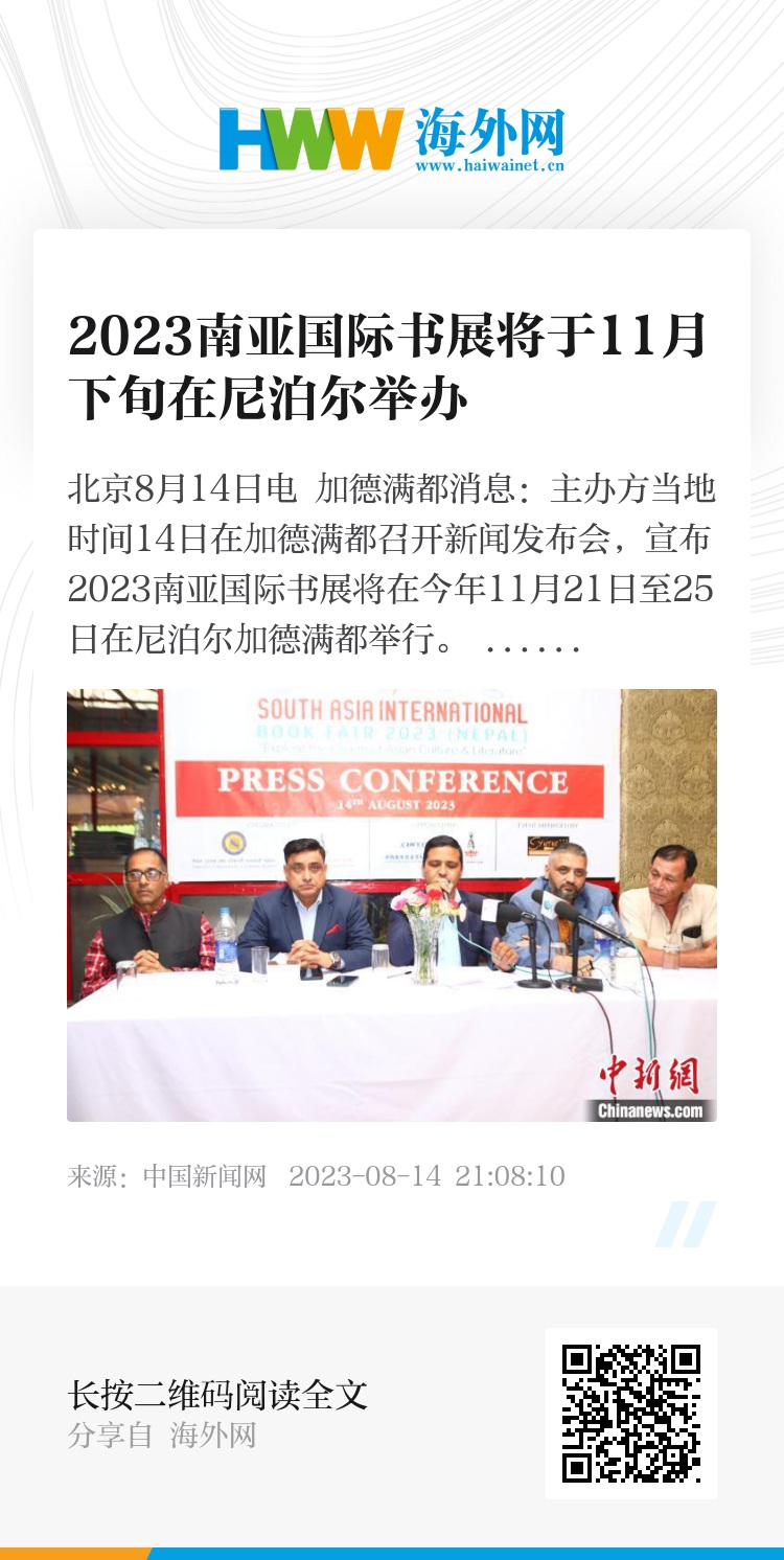 中新网北京8月14日电 加德满都消息:主办方当地时间14日在加德满都召开新闻发布会,宣布2023南亚国际书展将在今年11月21日至25日在尼泊尔加德满都举行。