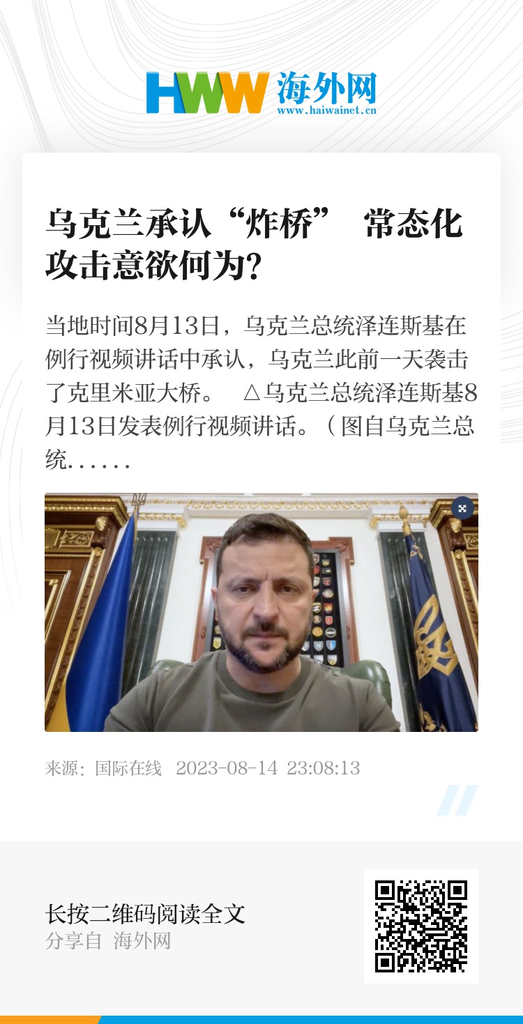 当地时间8月13日,乌克兰总统泽连斯基在例行视频讲话中承认,乌克兰此前一天袭击了克里米亚大桥。