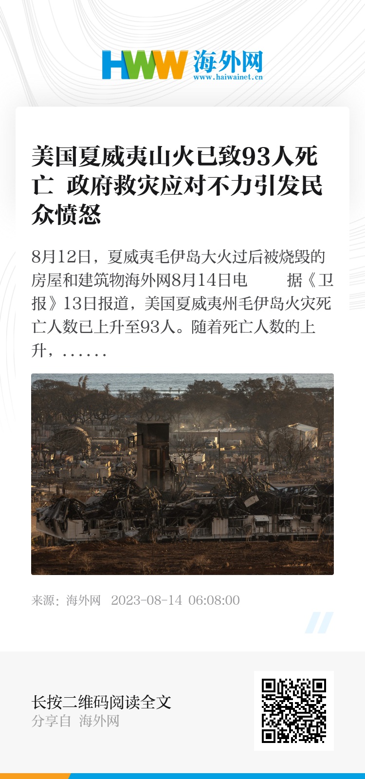 海外网8月14日电 据《卫报》13日报道,美国夏威夷州毛伊岛火灾死亡人数已上升至93人。随着死亡人数的上升,居民们对政府在各方面的应对措施不力越来越感到愤怒。