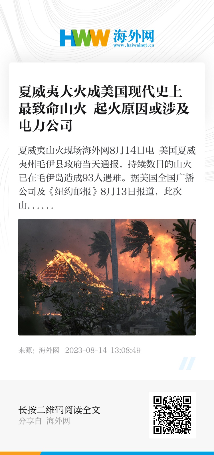 海外网8月14日电 美国夏威夷州毛伊县政府当天通报,持续数日的山火已在毛伊岛造成93人遇难。据美国全国广播公司及《纽约邮报》8月13日报道,此次山火是美国现代史上最致命的,起火原因或与当地电力公司的基础设施受损有关。