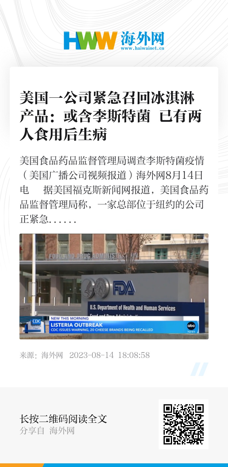 海外网8月14日电 据美国福克斯新闻网报道,美国食品药品监督管理局称,一家总部位于纽约的公司正紧急召回一批冰淇淋产品,这批产品疑受李斯特菌污染。