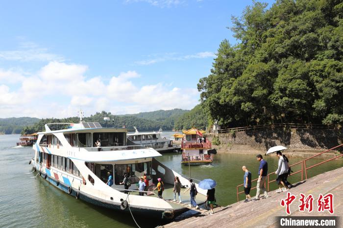 图为金湖游客登船。熊明欢摄