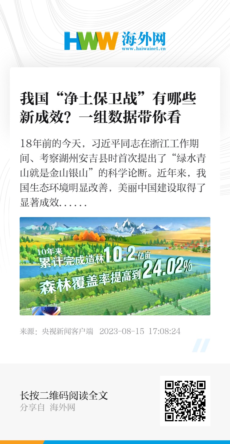 18年前的今天,习近平同志在浙江工作期间、考察湖州安吉县时首次提出了“绿水青山就是金山银山”的科学论断。近年来,我国生态环境明显改善,美丽中国建设取得了显著成效,天更蓝了、地更绿了、水更清了、环境更美了,我们通过一组数据来看看我国“净土保卫战”的新成效。
