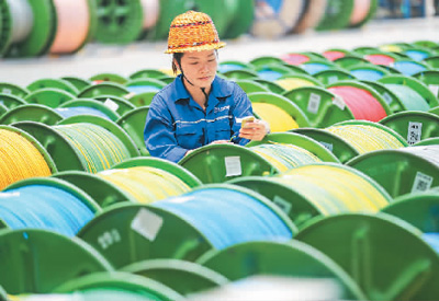 今年以来,浙江湖州支持企业运用5G、大数据、工业互联网等新一代信息技术,打造智能化车间,提升产品核心竞争力。图为位于湖州市德清县乾元镇的物产中大元通电缆德清智慧产业园内,工人在检测特种线缆产品。王树成摄(人民视觉)