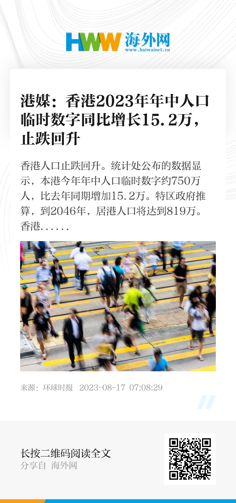 香港《星岛日报》16日称,香港人口曾在2019年达到752万的高峰,之后持续下降,不过跌势自去年年底终止。去年年底香港人口数字经修订后有所增长,达到747.26万人。最新公布今年年中的临时人口数字继续上涨,有749.81万人。人口上升主要得益于17.4万名居民净移入,包括3.1万名“单程证”持有人以及14.3万名其他香港居民的净移入。与此同时,出生人数为3.26万人,死亡人数为5.46万人。
