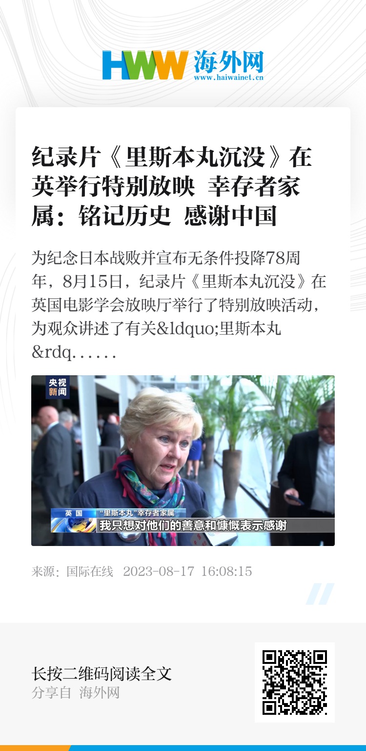 为纪念日本战败并宣布无条件投降78周年,8月15日,纪录片《里斯本丸沉没》在英国电影学会放映厅举行了特别放映活动,为观众讲述了有关“里斯本丸”号营救事件的始末。当天,包括“里斯本丸”号船英军战俘家属代表在内的约450人参加。