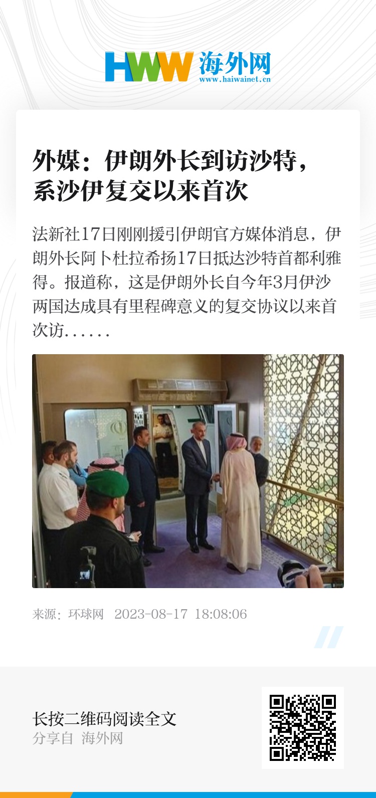 法新社17日刚刚援引伊朗官方媒体消息,伊朗外长阿卜杜拉希扬17日抵达沙特首都利雅得。报道称,这是伊朗外长自今年3月伊沙两国达成具有里程碑意义的复交协议以来首次访问沙特。