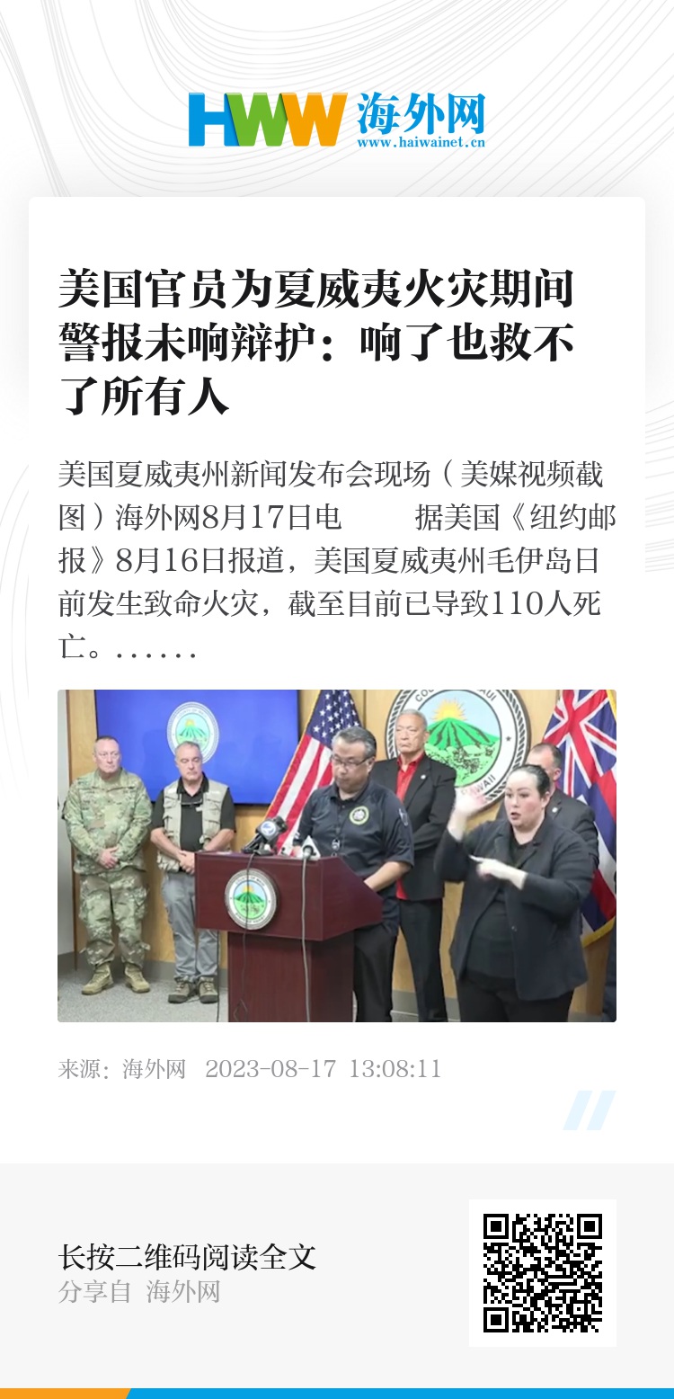 海外网8月17日电 据美国《纽约邮报》8月16日报道,美国夏威夷州毛伊岛日前发生致命火灾,截至目前已导致110人死亡。毛伊岛官员日前声称,他对野火席卷该岛时警报器未能启动“并不后悔”,还称即使拉响警报也救不了所有人。