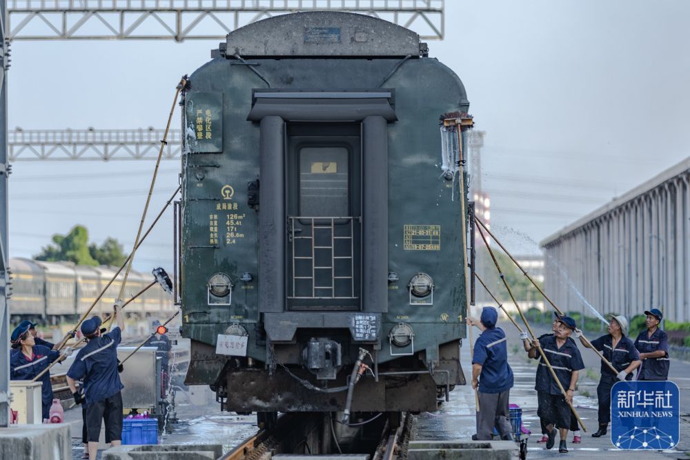 ↑8月15日,库内工作人员在重庆西客车整备所清洗库停列车外部。