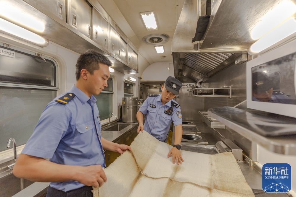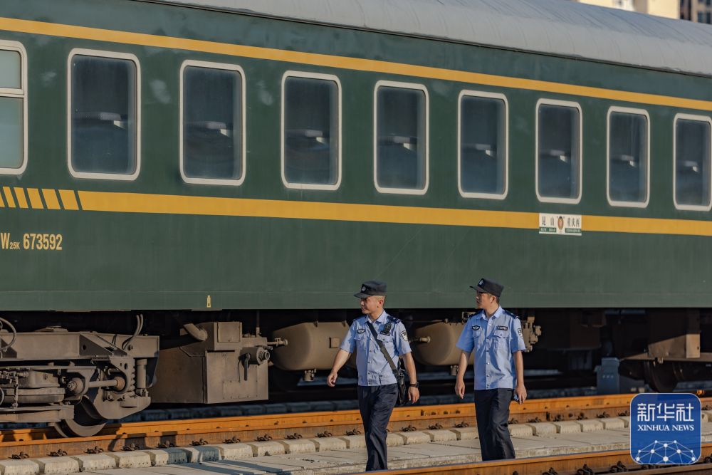 ↑8月15日,重庆铁路公安处民警彭聪(右)与重庆客运段列车长任炼在重庆西客车整备所检查库停车辆消防器材。