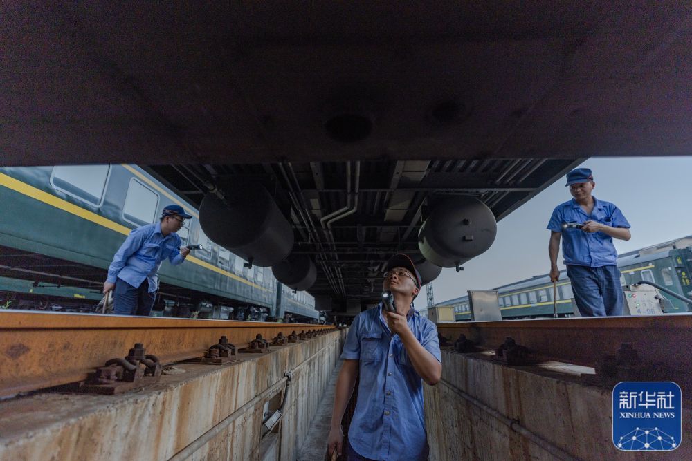 ↑8月15日,重庆车辆段工作人员在重庆西客车整备所对入库车辆进行检修。