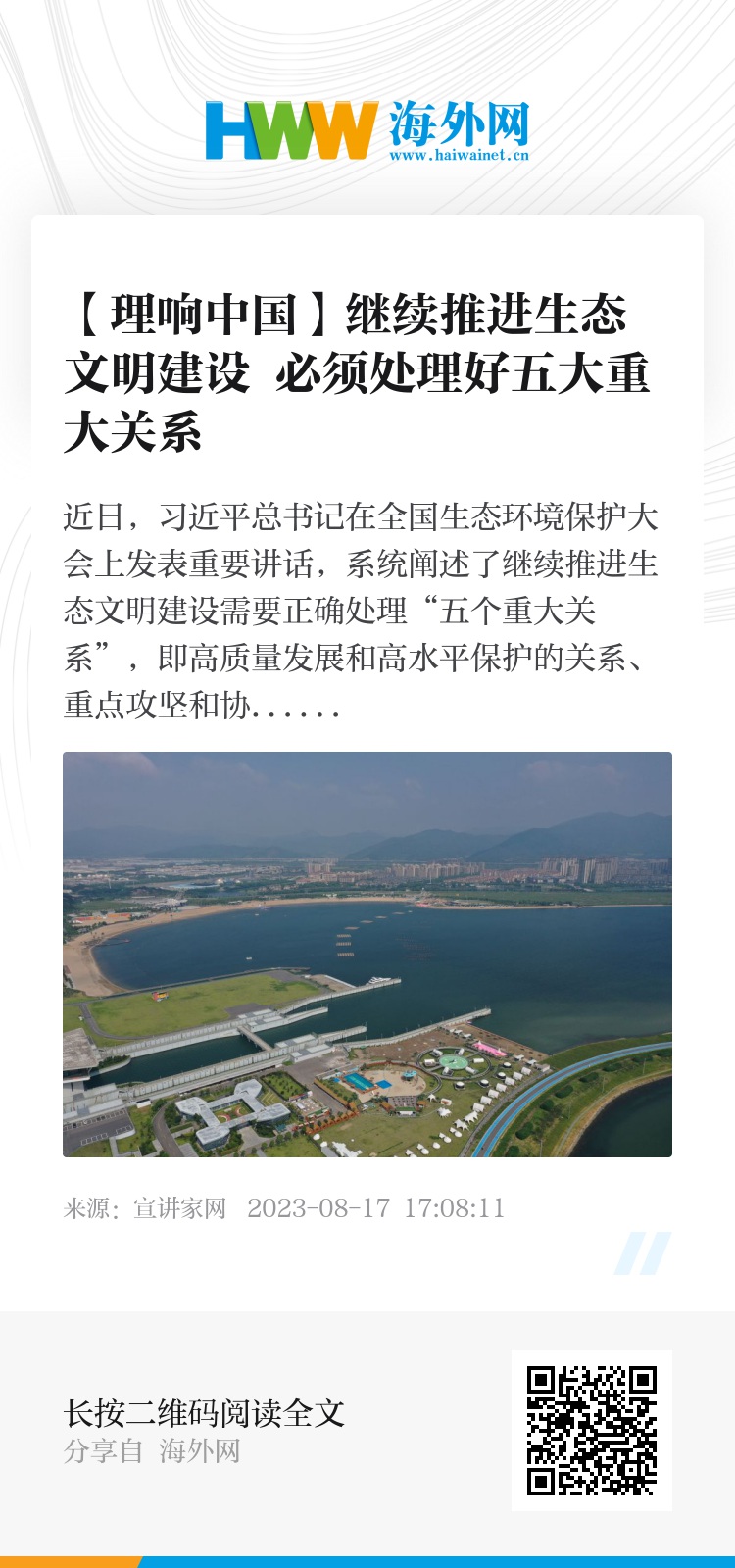 近日,习近平总书记在全国生态环境保护大会上发表重要讲话,系统阐述了继续推进生态文明建设需要正确处理“五个重大关系”,即高质量发展和高水平保护的关系、重点攻坚和协同治理的关系、自然恢复和人工修复的关系、外部约束和内生动力的关系、“双碳”承诺和自主行动的关系。“五个重大关系”既是实践经验的总结,又是理论概括,蕴含着丰富的价值观和方法论,也充满了深刻的道理学理哲理,为以美丽中国建设推进人与自然和谐共生的现代化提供了有力思想武器。新形势下,继续推进生态文明建设,必须处理好五个重大关系,以更高站位、更宽视野、更大力度全面推进美丽中国建设,让我国天更蓝、地更绿、水更清,万里河山更加多姿多彩。