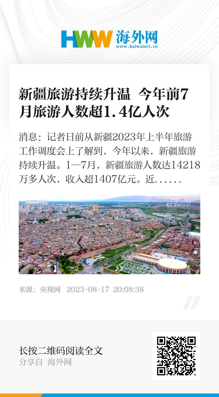 央视网消息:记者日前从新疆2023年上半年旅游工作调度会上了解到,今年以来,新疆旅游持续升温。1—7月,新疆旅游人数达14218万多人次,收入超1407亿元。