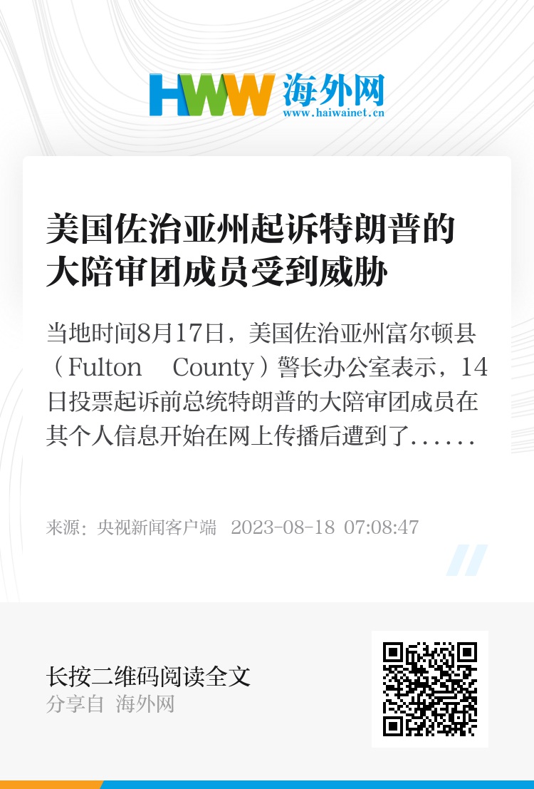当地时间8月17日,美国佐治亚州富尔顿县(Fulton County)警长办公室表示,14日投票起诉前总统特朗普的大陪审团成员在其个人信息开始在网上传播后遭到了威胁。