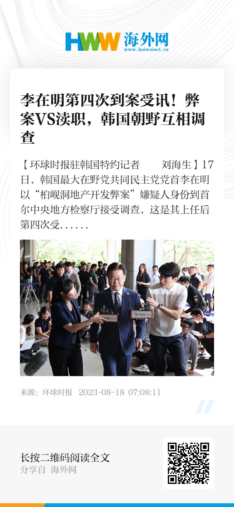 【环球时报驻韩国特约记者 刘海生】17日,韩国最大在野党共同民主党党首李在明以“柏岘洞地产开发弊案”嫌疑人身份到首尔中央地方检察厅接受调查,这是其上任后第四次受讯。