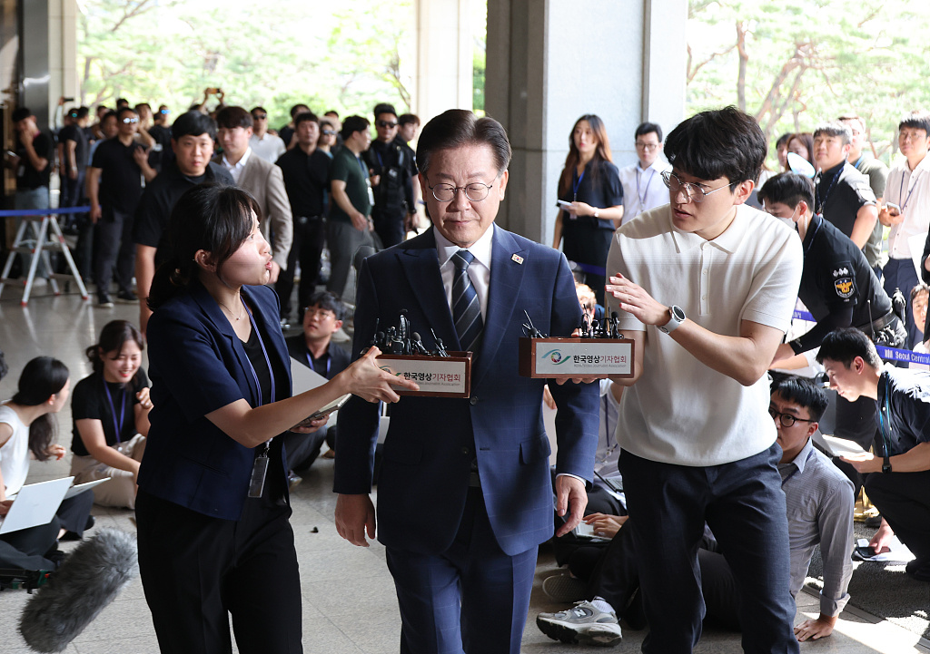 当地时间2023年8月17日,韩国首尔,共同民主党党首李在明在以地产弊案嫌疑人身份抵达中央地方检察厅。(视觉中国)