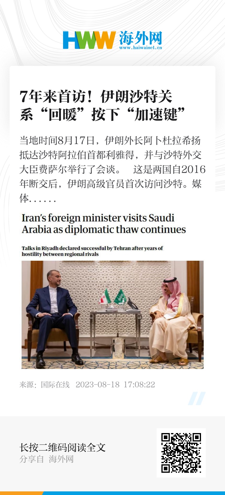这是两国自2016年断交后,伊朗高级官员首次访问沙特。媒体注意到,整整两个月之前,费萨尔曾到访伊朗首都德黑兰,先后会见了阿卜杜拉希扬和总统莱希。短短两个月,两国外长就实现了互访,标志着两国关系的回暖进程按下了“加速键”。