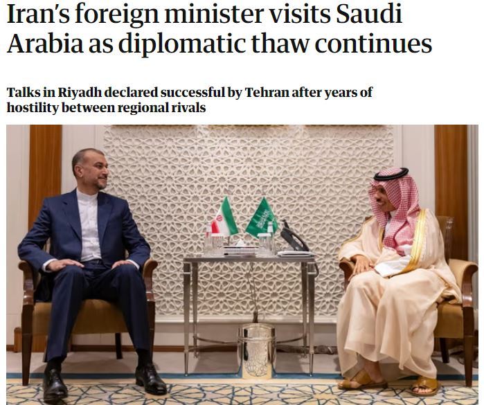 △英国《卫报》网站:伊朗外交部长访问沙特阿拉伯,外交解冻持续。(题图左为伊朗外长阿卜杜拉希扬,右为沙特外交大臣费萨尔)