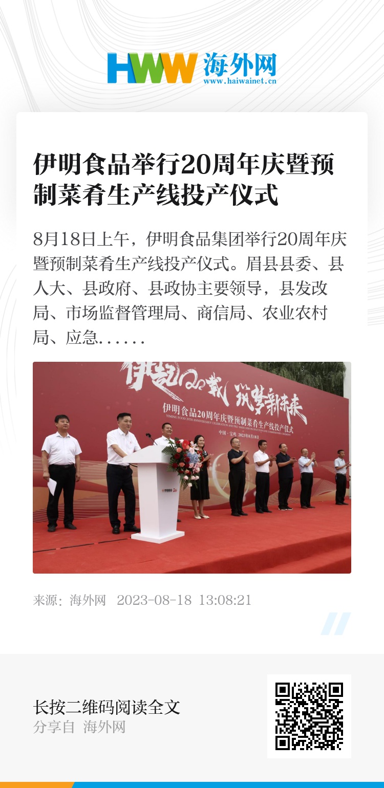 8月18日上午,伊明食品集团举行20周年庆暨预制菜肴生产线投产仪式。眉县县委、县人大、县政府、县政协主要领导,县发改局、市场监督管理局、商信局、农业农村局、应急管理局、住建局、自然资源局、统计局等主要负责人等出席活动。